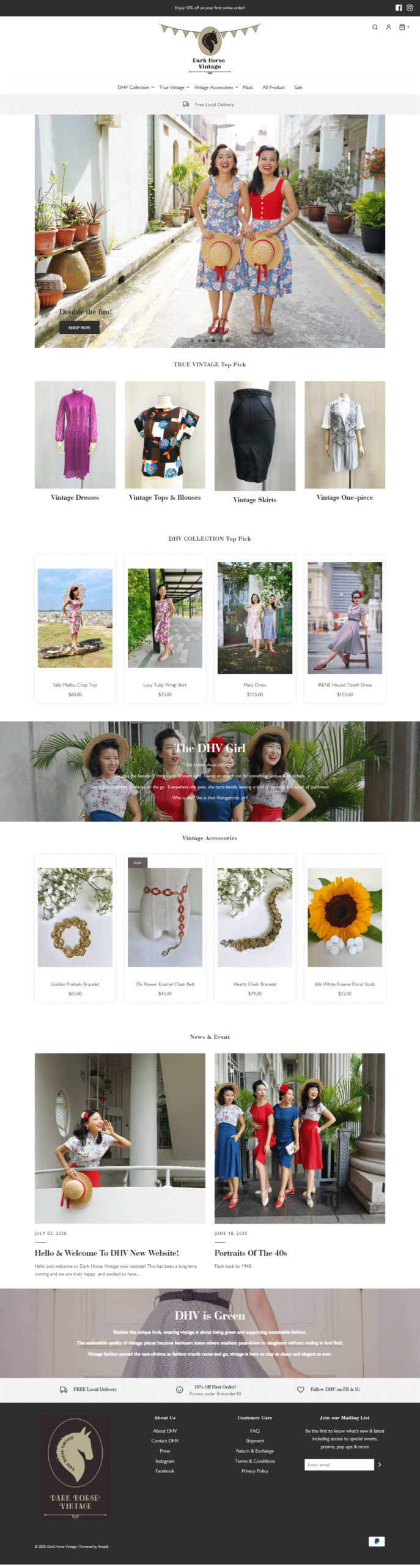 Dark Horse Vintage offers a curated selection of modern vintage–inspired apparel and one-of-a-kind true vintage pieces, including dresses, tops, skirts, and accessories. The brand—proudly “vintagetastic”—delivers exclusive, sustainably sourced styles and celebrates green fashion, often featuring single-quantity releases for that unique touch. Based in Singapore, DHV provides free local delivery and international shipping for orders over SGD 250, with flexible pick-up options at their “Eclectic Room” location.